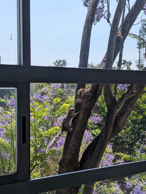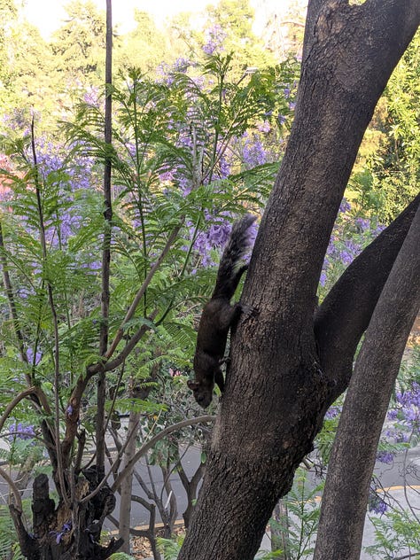 This last jacaranda season was my third since moving here, and it was only this year that I noticed that the flowers bring with them another seasonal occupant: the squirrels.